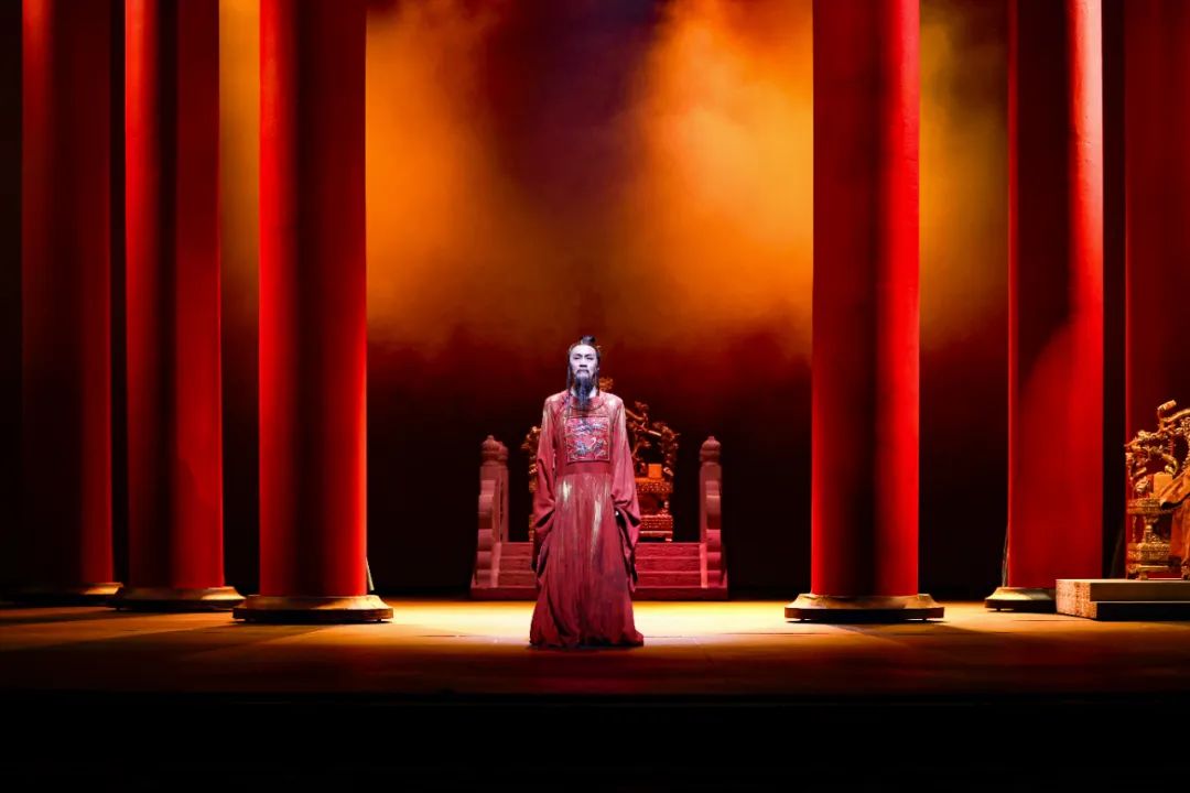 没有巍峨的宫殿林立,也没有满台的宫人环绕,“八柱三椅一墙”构建起《张居正》简洁、空灵而又富有诗意的表演空间。八根雄伟高耸的红柱和大小不一的三把龙椅成为庙堂与权力的象征,而随着剧情的推动,红柱在舞台上丝滑流动,伴随场次的交替,在多媒体的配合下,变换出多种画面,形成天与地、阴与阳、现实与非现实的多重空间和视觉隐喻,极具感染力地参与到舞台叙事之中。
